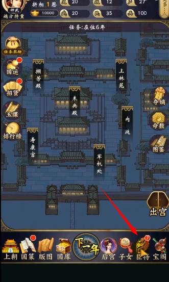 2、首先是上朝,随机点击兵部、礼部等上书奏折,根据选择来获取/减少声望■◆、政务。